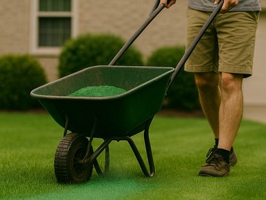Use a wheelbarrow, shovel, or broadcast spreader to evenly distribute LawnLevel™ across your lawn. Focus on low spots, uneven areas, or places with bare patches. Aim for a light and even layer across the entire surface — generally ¼ to ½ inch thick.